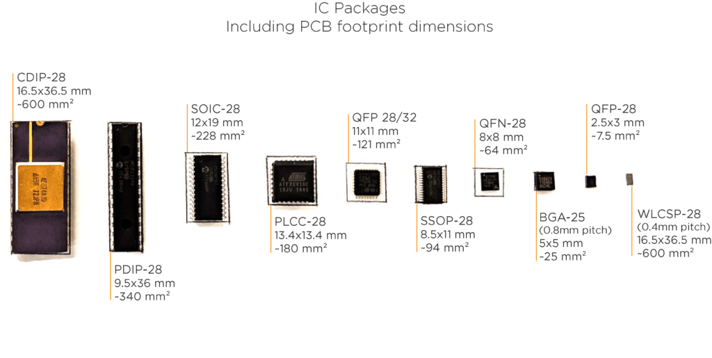 While reducing package size can work well for small digital ICs, it rarely works for power electronics, RF, analog signal conditioning, filters, or other electronics that depend upon physical characteristics that are not scaled with the IC package.